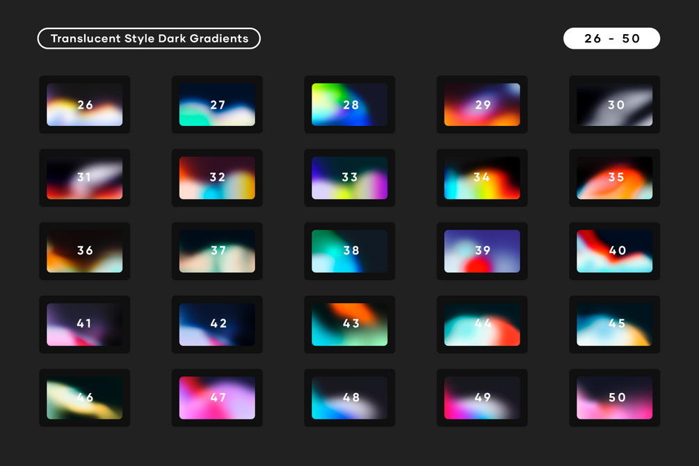 A new pack of 50 Translucent Style Dark Gradients Background contains colorful and vibrant dark gradients. Perfect for use as background on your UI as Translucent or Glass effect. Great as well to use on everything that you can imagine for, wallpapers, backgrounds, UI-UX, branding, text, and more. With outstanding quality and with no banding at all using .PNG format.