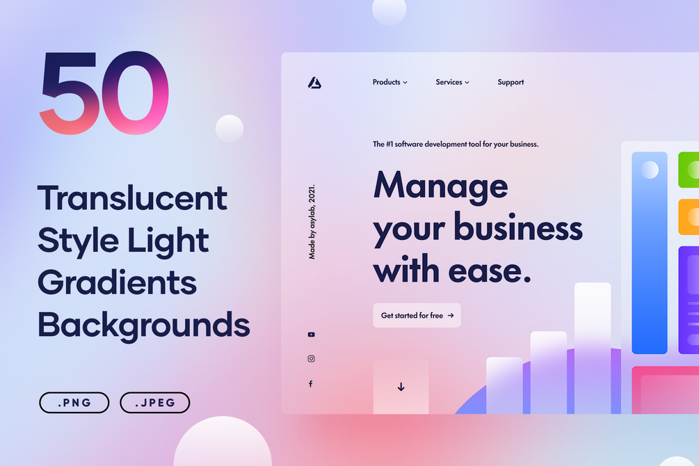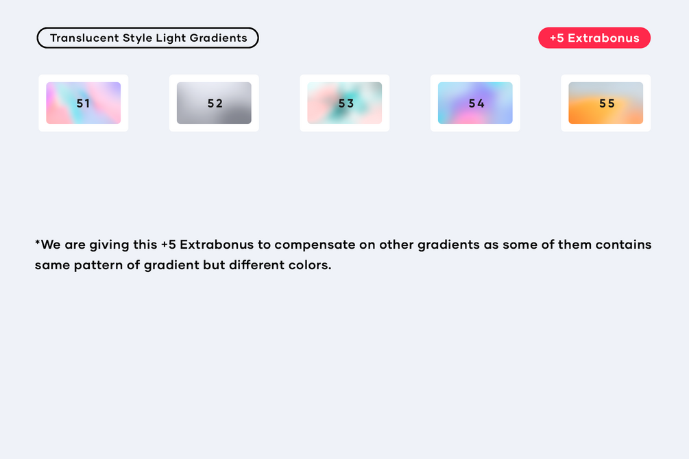 A new pack of 50 Translucent Style Light Gradients Background contains colorful and vibrant light gradients. Perfect for use as background on your UI as Translucent or Glass effect. Great as well to use on everything that you can imagine for, wallpapers, backgrounds, UI-UX, branding, text, and more. With outstanding quality and with no banding at all using .PNG format.