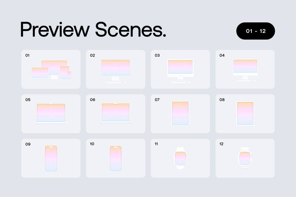 The 12 Apple Devices Clay Mockups collection is designed for designers who prefer a clean, minimal aesthetic that keeps the focus on the interface. With a soft clay finish and simplified forms, these mockups remove visual noise while maintaining professional structure. Flexible customization options let you adapt colors, backgrounds, and layouts to fit your brand or concept, whether you are building a portfolio or preparing client-ready visuals.
