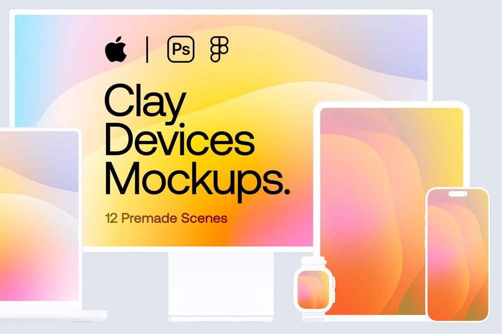 Apple Devices - 12 Clay Mockups Scenes - PSD & FIG