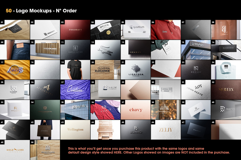 WATCH MORE PREVIEW IMAGES -> https://www.behance.net/gallery/88366715/50-Logo-Mockups-Branding-Bundle-PSD