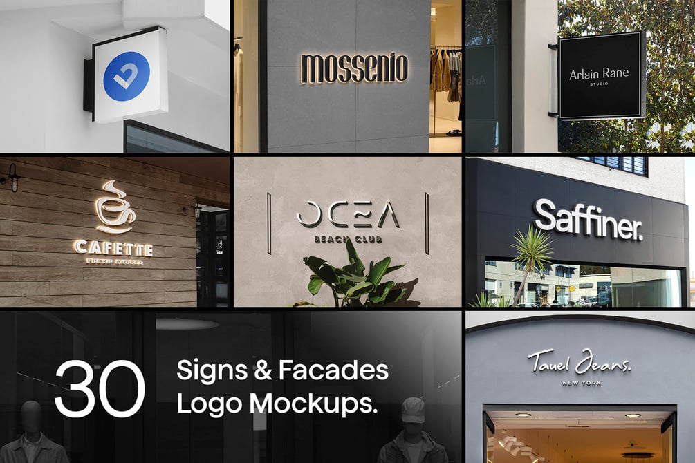WATCH MORE PREVIEW IMAGES ->Â https://www.behance.net/gallery/199923749/30-Signs-Facade-Logo-Mockups-V3-PSD