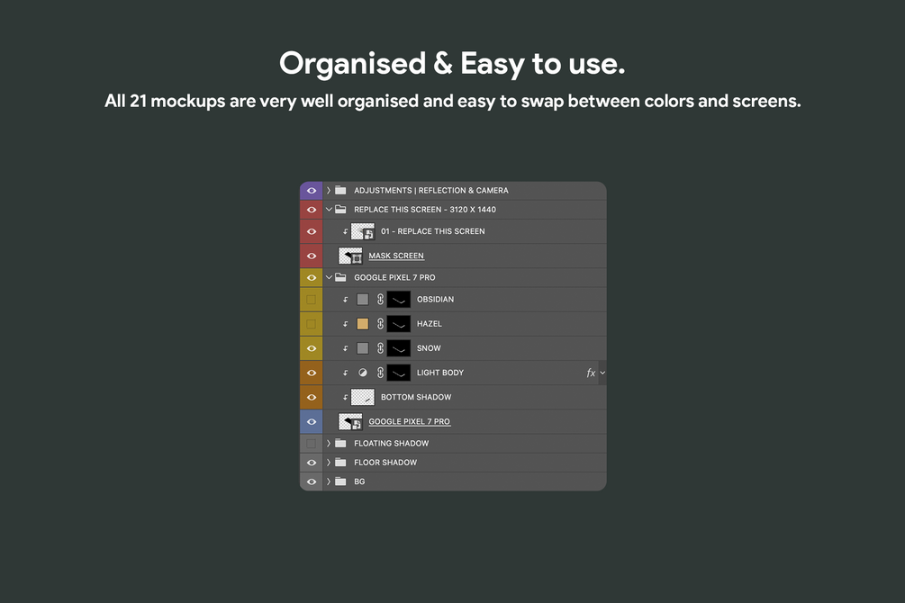 - Each PSD Mockup has inside 3 Default Colors - (Snow, Obsidian & Hazel).