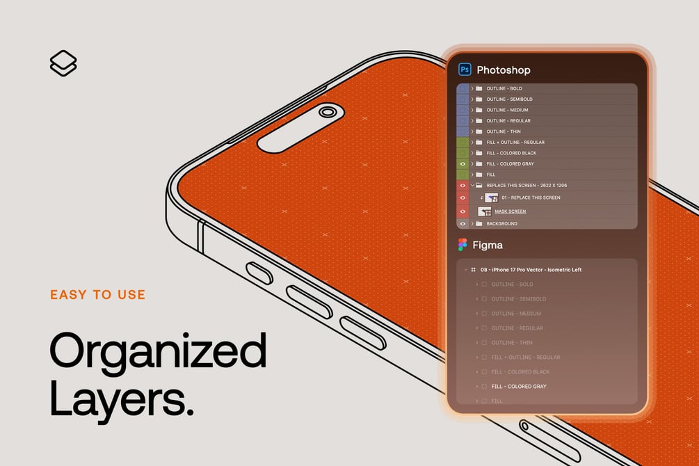 - Includes iPhone 17 Pro Vector Outline & Fill - 24 Mockup Scenes - PSD and 1 Figma file. (All the scenes that you will see in the 2nd and 3rd picture are included).