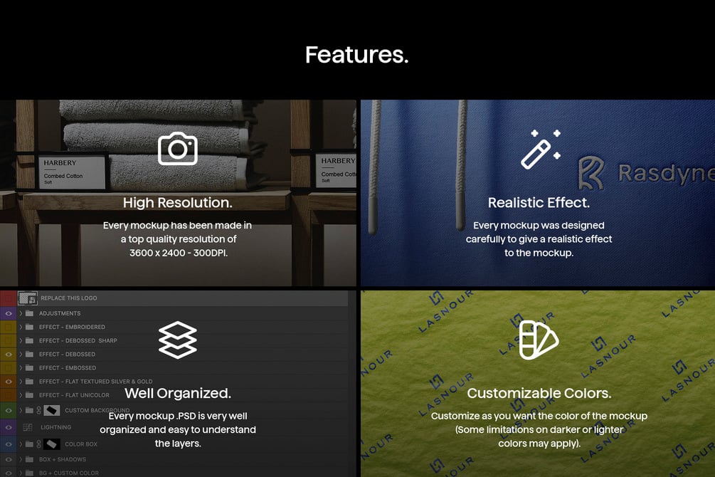 Logo Mockup includes smart objects (REPLACE THIS SCREEN) having 5 different logo effect style (Flat Unicolor, Flat Colored, Flat Silver & Gold, Debossed, Embossed). Customizable color of the coat. Customizable ambient lights.