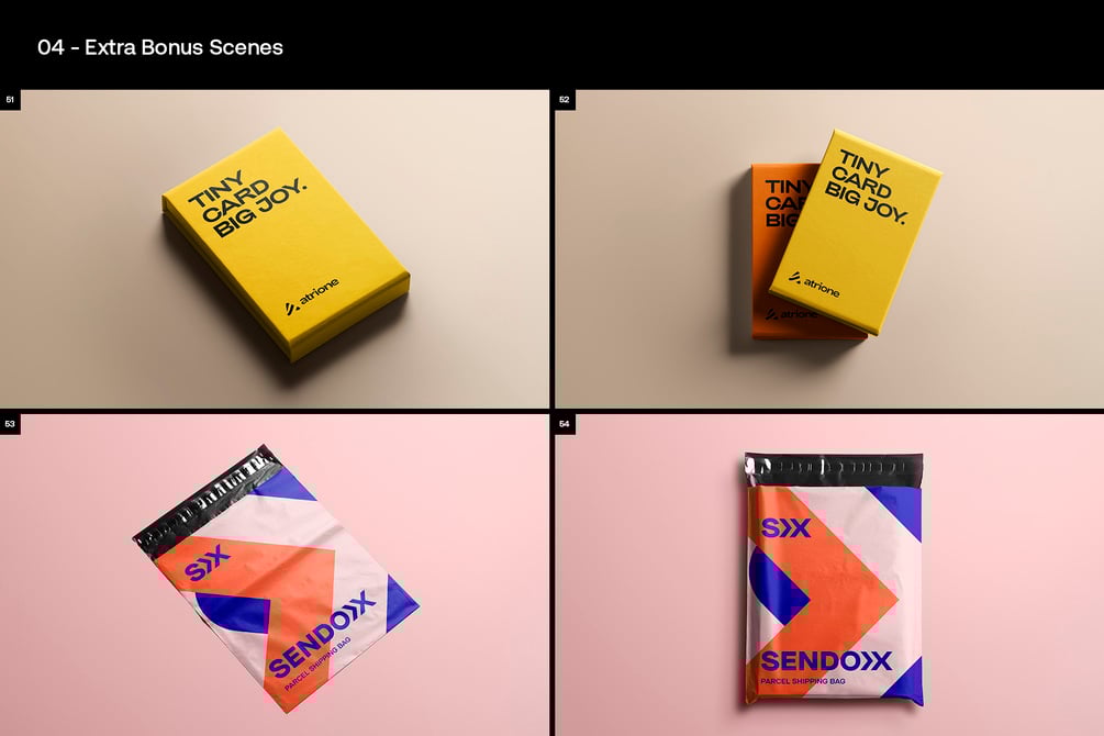 Logo Mockup includes smart objects (REPLACE THIS SCREEN) having 1 different design effect style (Flat Colored). Includes the Front and Back part of the parcel shipping bag including on each Floor and Floating shadows. Customizable color of the parcel shipping bag and background. Customizable adjustment lights.