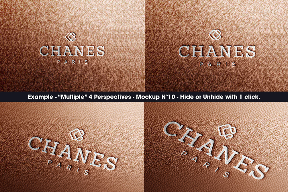 Logo Mockup includes smart objects (REPLACE THIS SCREEN) having 5 different effect styles (Embossed, Debossed, Flat, Flat Colored & Flat Textured Original Leather). Includes also 4 different perspectives. Customizable color of the background, ambient lights and ambient blur.