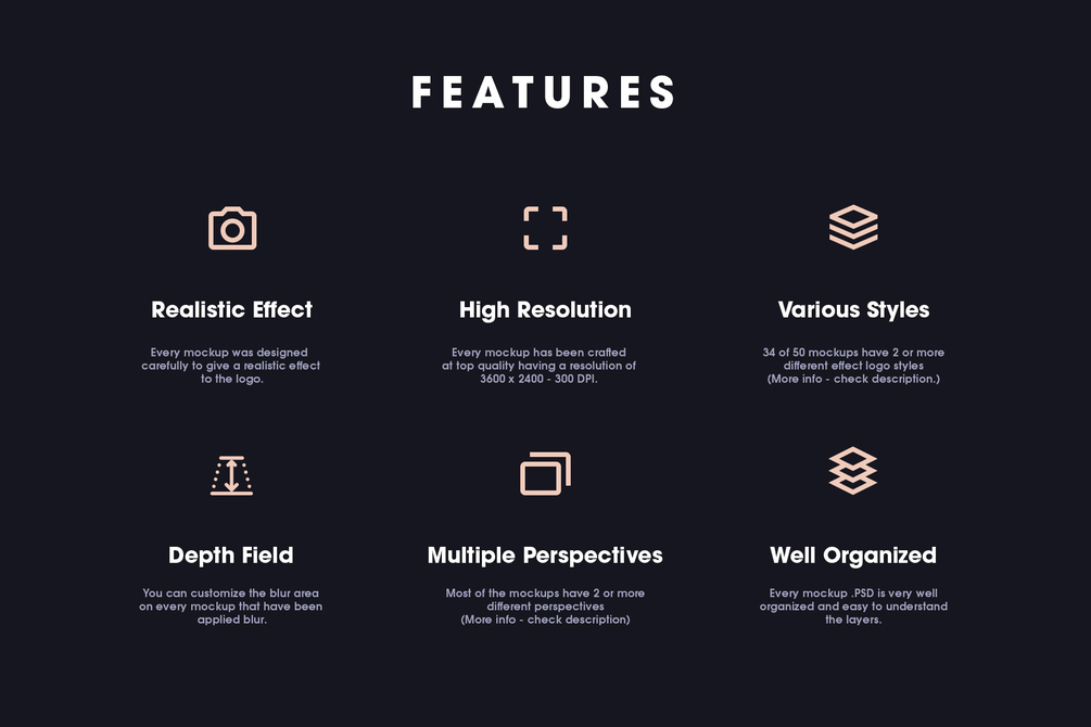 Logo Mockup includes smart objects (REPLACE THIS SCREEN) having 2 different effect styles ( Debossed & Flat textured design). Includes also 4 different perspectives. Customizable color of the paper, background, ambient lights and ambient blur.