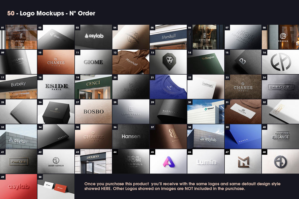 WATCH MORE PREVIEW IMAGES ->Â https://www.behance.net/gallery/94893645/50-Logo-Mockups-Branding-Bundle-PSD
