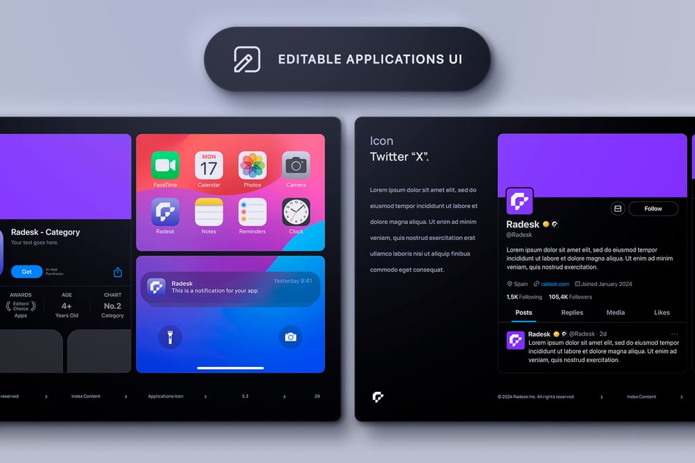 The template is fully customizable and editable. Replace the logo with a few clicks automatically using Smart Objects in 115 positions including Mockups, Icon iOS, Icon MacOS, Icon Instagram, and more. Or 92 positions in Figma with Components (Section 6.1, 6.2, 6.3 and 6.4 Imagery Logo will not be replaced in Figma).